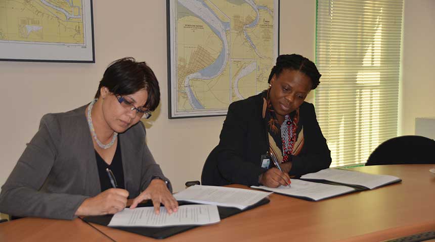 Op bijgaande foto ondertekenen de directeur van ACT-Suriname Mw. Minu Parahoe (links) en de directeur van het Celos, Mw. Inez Demon (rechts) de samenwerkingsovereenkomst op donderdag 7 december 2017.
