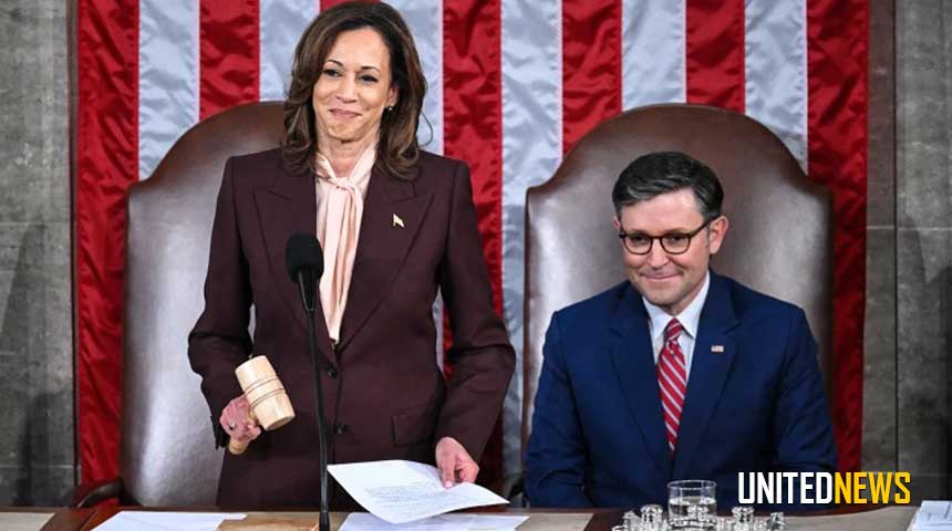 Foto: Vicepresident Kamala Harris bekrachtigt, met de hamer in de hand, officieel de verkiezingsoverwinning van Donald Trump, terwijl House Speaker Mike Johnson instemmend toekijkt. | Bron: RTNews