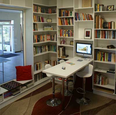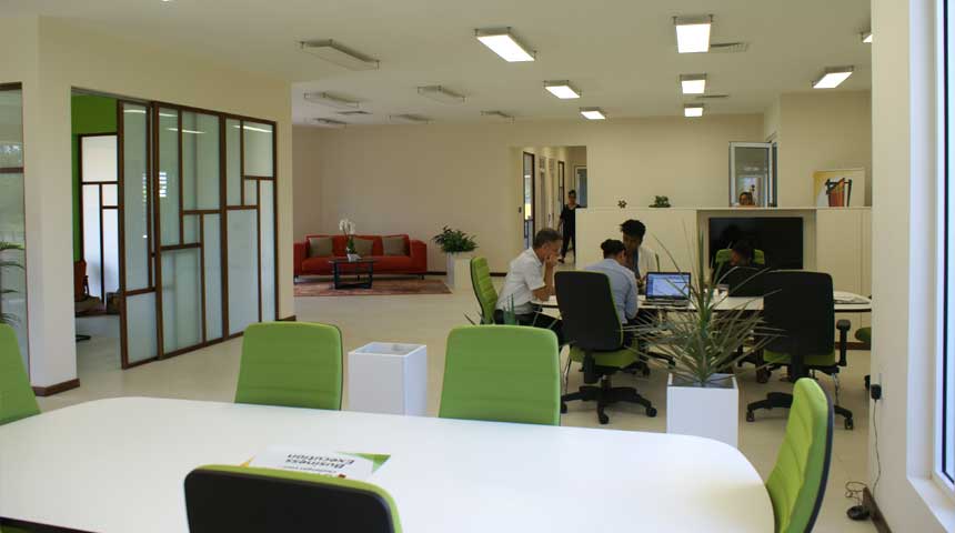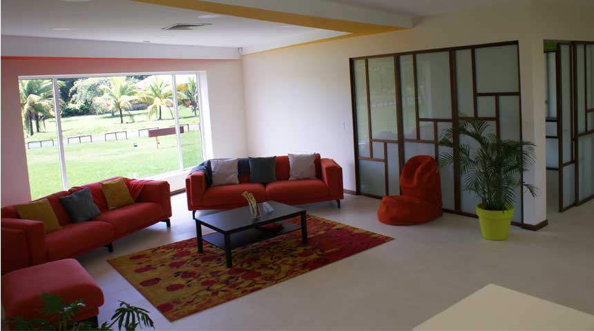Als je vervolgens gedurende de dag het zitten op je ergonomische stoel even zat bent, is er een warme chill-corner, met superzachte licht-rode bankstellen, poef en andere gemakken, waarin je kunt wegglijden met je laptop om samen met je collega’s het volgende project door te nemen.