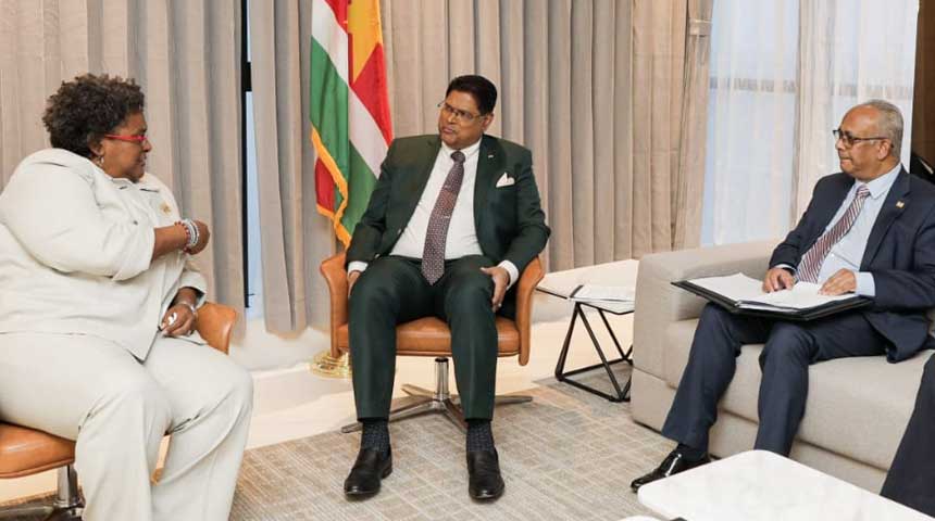 Suriname en Barbados willen hun bilaterale samenwerking versterken. Hierover hebben de Surinaamse president Chandrikapersad Santokhi en de Barbadiaanse premier Mia Amor Mottley zich gebogen tijdens een ontmoeting op maandag 14 februari in buurland Guyana.