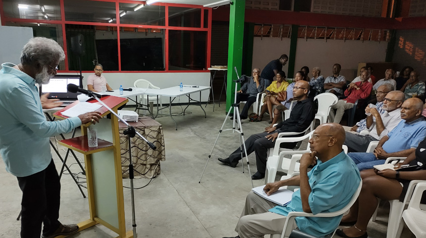 FOTO: Advocaat Irvin Kanhai spreekt de aanwezigen toe over de juridische aspecten van de grondconversie in het PALU centrum.