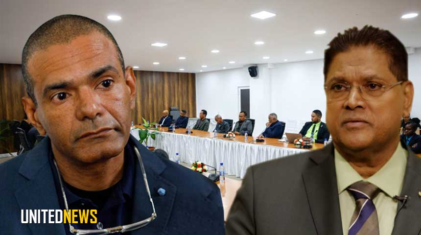 Foto: President Chandrikapersad Santokhi en coördinator werkgroep Integraal Sociaal Programma (ISP), Mark Rommy.