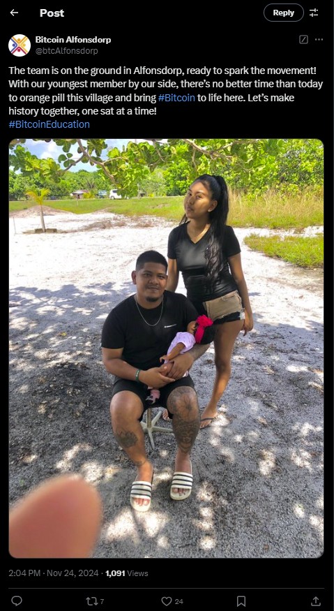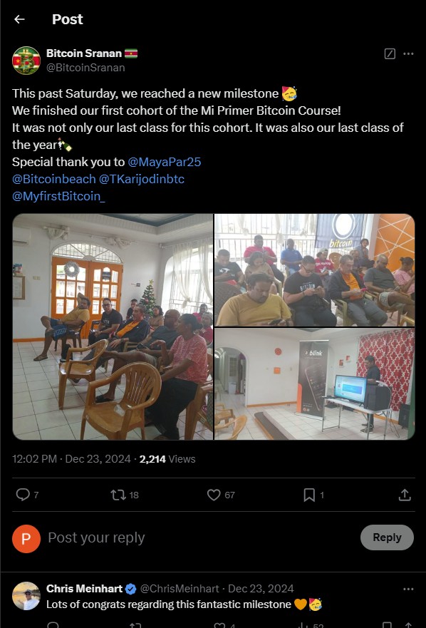 Maya Parbhoe richtte Bitcoin Sranan in 2021 op na een bezoek aan El Salvador, waar ze de transformerende kracht van Bitcoin in gemeenschappen zoals El Zonte van dichtbij meemaakte. Terence Coronel, een vastberaden lokale inwoner, leidt nu het project en richt zich op educatie via het “Mi Primer Bitcoin”-curriculum. Met zijn enthousiaste benadering bezoekt hij dagelijks winkels en huishoudens om mensen kennis te laten maken met Bitcoin als betaalmiddel.