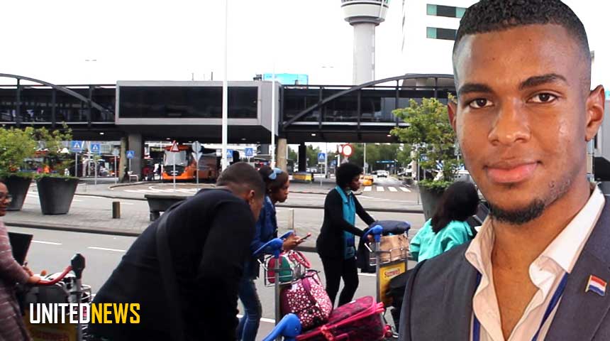 Fotocompilatie: Aankomst van Curaçaose studenten op Schiphol, en op de voorgrond jongeren VN-vertegenwoordiger Kevin Eustatia-Palm | Bron: Caribisch Netwerk
