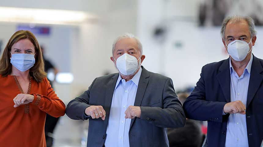Foto boven: Gleisi Hoffmann, Lula en Aloisio Mercadante bij de voorstelling van het “Plano de Reconstrução do Brasil”.