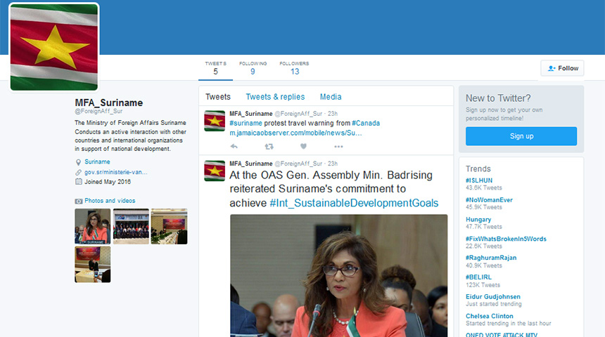 Het Ministerie van Buitenlandse Zaken kan thans gevold worden via: https://twitter.com/foreignaff_sur