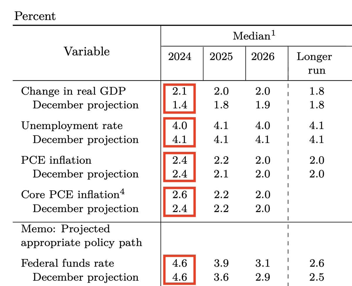 In vergelijking met december valt vooral op hoe positief de Amerikaanse centrale bank over het BBP is: 1,4% versus 2,1% voor 2024. Ook voor 2025 en 2026 verwacht het een BBP-groei van 2,0% waar dat eerder nog 1,8% en 1,9% was.