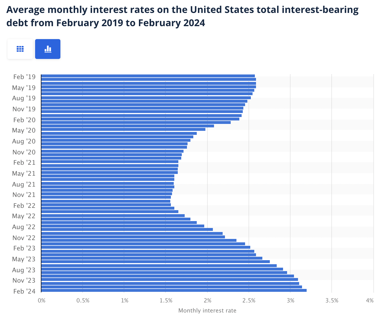 Zoals je kunt zien neemt de gemiddelde rente op de Amerikaanse schuld momenteel in rap tempo toe. Op het moment van schrijven ligt die rente op 3,2% wat betekent dat ze jaarlijkse ~1,1 biljoen dollar aan rentekosten kwijt zijn.
