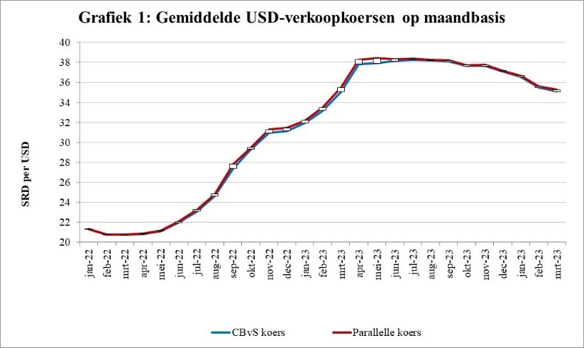 Thans merken wij een tendens van dalende wisselkoersen, wat impliceert dat de Surinaamse dollar in waarde toeneemt ten opzichte van de US-dollar en de euro in vergelijking met de wisselkoersontwikkelingen in de eerste helft van 2023.