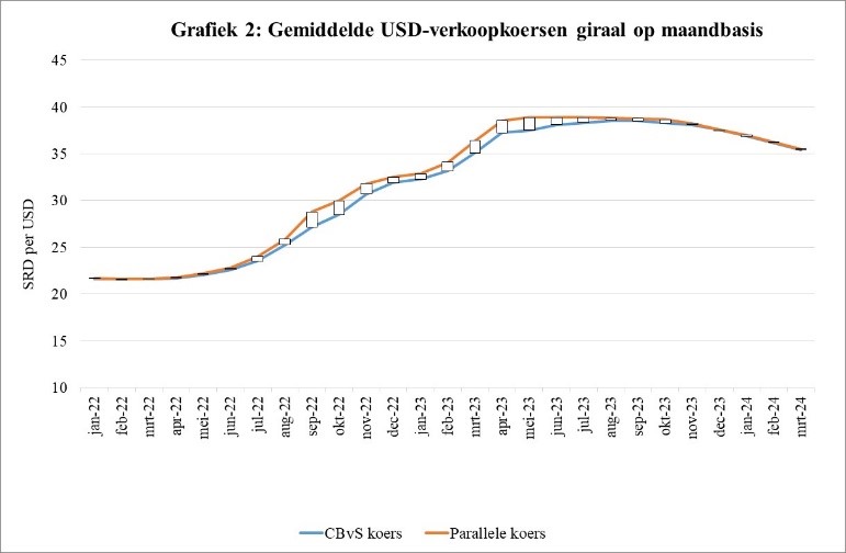 Opmerkelijk is het afgenomen en te verwaarlozen verschil tussen de wisselkoersnoteringen van de Bank en de parallelmarkt voor vreemde valuta sinds de tweede helft van 2023. De Bank verwacht dat deze neerwaartse wisselkoersontwikkelingen vooralsnog zullen aanhouden.