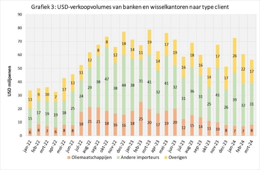 Op de valutamarkt is de vraag naar US-dollar aan het afnemen mede onder invloed van de afgenomen vraag van voornamelijk de oliemaatschappijen en overige importeurs. Grafiek 3 verschaft een beeld van de verkoopvolumeontwikkelingen in de US-dollarsfeer bij de wisselkantoren en de banken gezamenlijk gedurende januari 2022 tot en met maart 2024 verdeeld naar type cliënt.