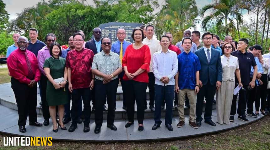 Foto: President Jennifer Simons, vicepresident Gregory Rusland, minister van Openbare Werken en Ruimtelijke Ordening Stephen Tsang en genodigden bij het Vriendschapspark aan de Jagernath Lachmonstraat, tijdens de 172ste herdenking van de Chinese immigratie.