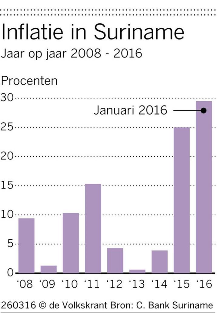 Sinds afgelopen woensdag is de voorheen vaste wisselkoers tussen de Surinaamse en de Amerikaanse dollar voor het eerst weer losgelaten, nadat de officiële koers en de straatwaarde net als vroeger fors uit elkaar waren gelopen. De inflatie tussen februari 2015 en februari dit jaar bedroeg in Suriname ruim 30 procent.