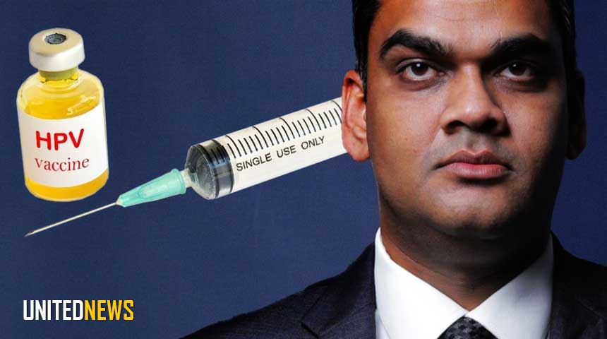 Auteur: Jef Crab | Fotocompilatie: Minister Amar Ramadhin van Volksgezondheid achtergrond het HPV-vaccin.