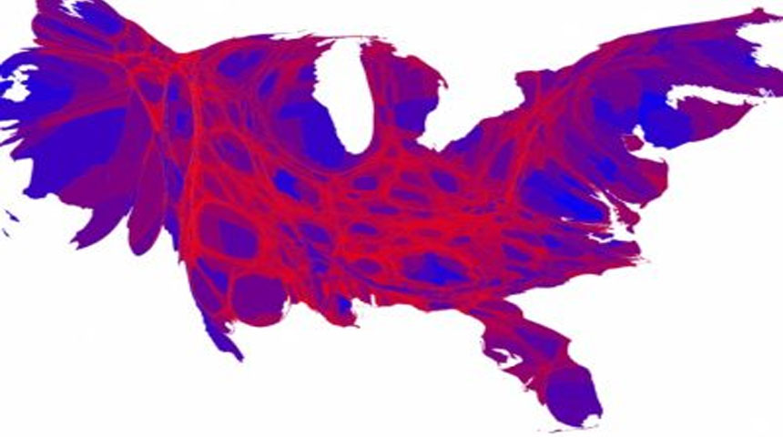 Het resultaat is fascinerend en laat zien dat de VS is opgesplitst in ‘stadse’ Democraten en Republikeinen op het platteland.