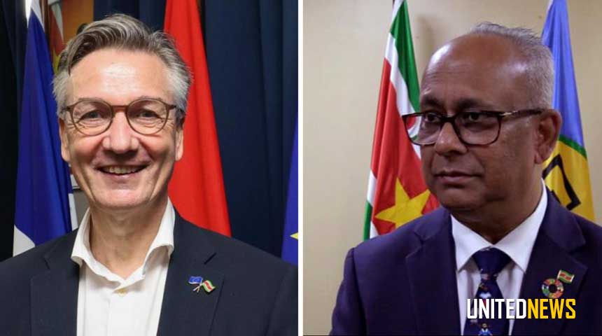 Fotocompilatie: EU-ambassadeur René van Nes en minister van Buitenlandse Zaken Albert Ramdin.