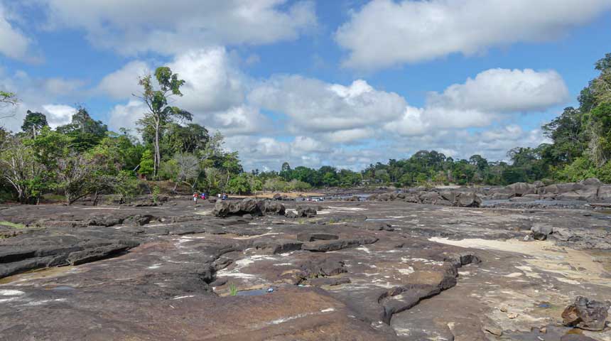 Foto: Een drooggevallen gedeelte van de Boven-Surinamerivier nabij het dorp Atjoni. De droogte wordt omschreven als de ernstigste “in minstens 20 jaar”. | Foto: Jason Pinas | Bron: The Guardian. | Auteur: Jason Pinas.