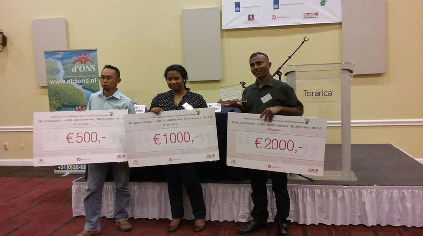 Boer Sewradj uit Saramacca, die tajerblad verbouwd mag zich duurzaamste landbouwer van het jaar noemen. Hij kreeg vandaag een award en EUR 2.000 van Stichting d’Ons, tijdens een congres in de royal ballroom van hotel Torarica. Een vier koppige jury was het er unaniem over eens dat Sewradj onder meer milieu vriendelijk en duurzaam teelt, en een positieve sociaal maatschappelijk bijdrage levert aan de omgeving. Op de tweede plaats eindigde Firdaus Garden, die EUR 1.000 kreeg en de derde prijs ging naar de Little Big Organic garden.
