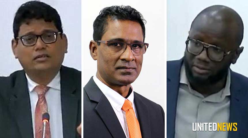 Fotocompilatie: VHP-fractieleider Asiskoemar Gajadien, drs. Dew Sharman (vicevoorzitter) en NDP-lid Ebu Jones | Auteur: Wilfred Leeuwin.