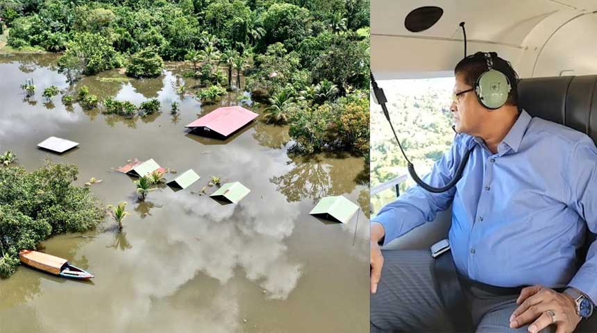Foto compilatie: Ex-president Santokhi kijkend vanuit een helicopter naar de desbetreffende overstroming benedenloop Surinamerivier