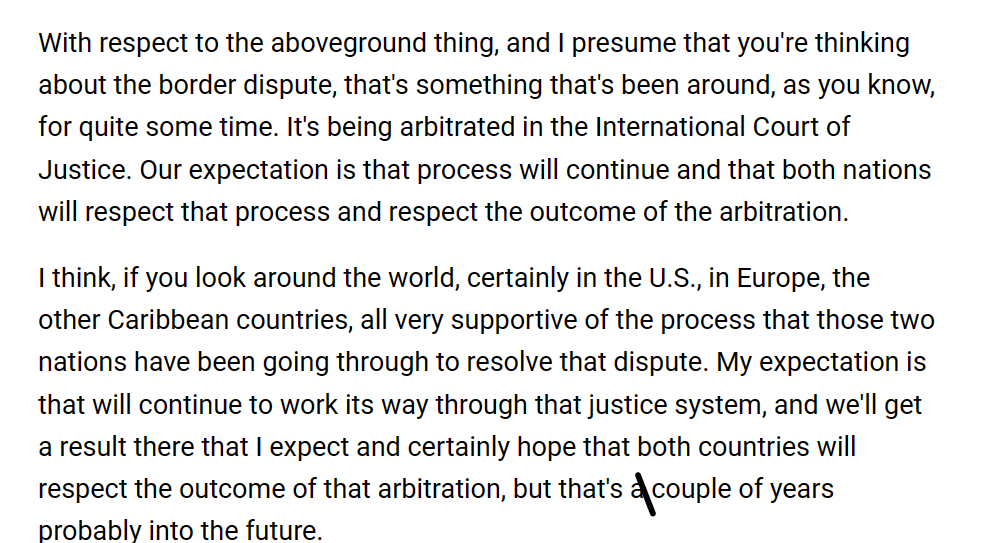 Het grensgeschil met Guyana zal hoogstwaarschijnlijk geen invloed hebben op de offshore business in Guyana, laat staan op de offshore business in Suriname. Guyana heeft te veel aanjagers zoals Brazilië die waarschijnlijk snel een einde zouden maken aan eventuele ongunstige uitkomsten. De Verenigde Staten zijn momenteel ook aanwezig in Guyana.