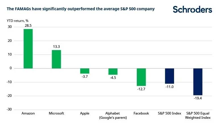 De relatief sterke positie van de techreuzen speelt ook op de beurs een grote rol. Dat blijkt uit onderstaande tabel van Schroders. Het gaat hier om de koersprestaties sinds de start van dit jaar tot medio april. De actuele cijfers zullen afwijken, maar het beeld is illustratief.