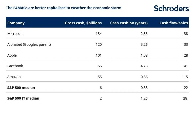 Maar structureel kunnen de techreuzen garen spinnen bij de crisis, zo stelt vermogensbeheerder Schroders maandag in een analyse.