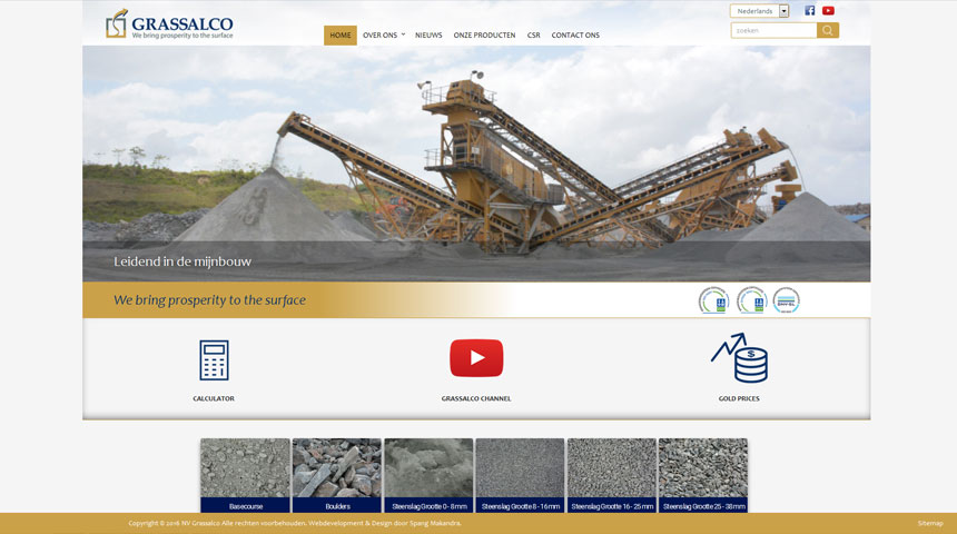 Sprekende foto’s van ons assortiment op de homepage van de Grassalco website – basecourse, boulders en steenslag in verschillende grootten – geven de bezoeker een goed beeld van de core business van het staatsmijnbouwbedrijf. Aangezien Grassalco ook aan goudexploraties en exploitatie doet, wordt de websitebezoeker ook geïnformeerd over de wereldmarktprijzen voor dit edele metaal. Op Maripaston in Para wordt kwikvrij aan kleinschalige goudwinning gedaan.
