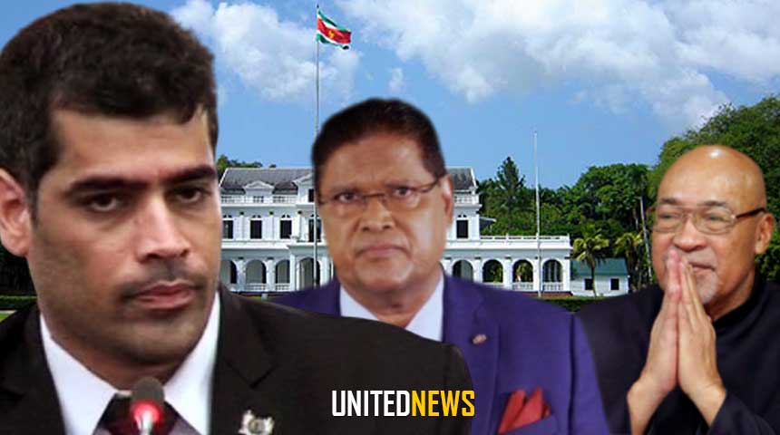 Fotocompilatie: Voormalig vicepresident en NDP-ondervoorzitter Ashwin Adhin, president Chandrikapersad Santokhi en de voortvluchtige ex-president, tevens erevoorzitter van de NDP, Desi Bouterse.