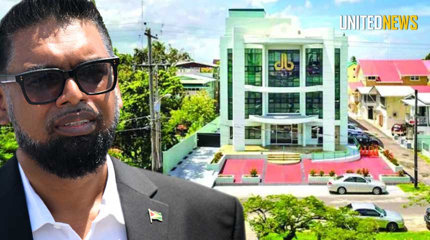 Foto: President Irfaan Ali voor de Demerara Bank Limited