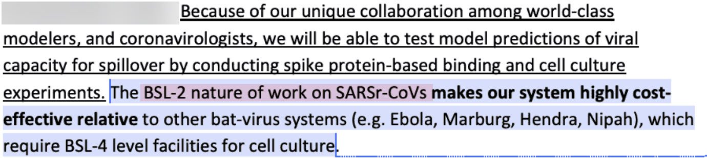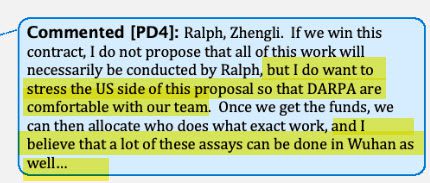 De toevoeging van Peter Daszak was ook bijzonder. Daszak schrijf hierin dat in het voorstel staat dat het onderzoek in Amerika zal worden uitgevoerd. Maar dat dit gedaan was om de kans voor het verkrijgen van de subsidie te vergroten. En als het geld binnen is kan een hoop werk in Wuhan worden uitgevoerd.