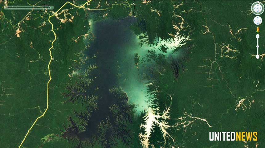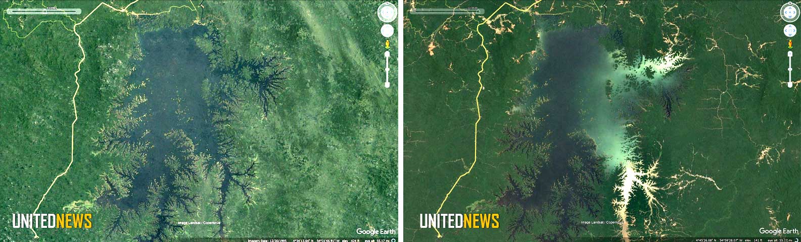 Foto links: In 1995 was er geen zichtbare goudwinning rond en op het stuwmeer. | Foto rechts: Veelvuldig zichtbare goud activiteiten in 2020