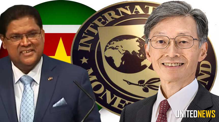Foto: President Santokhi en Kenji Okamura, plaatsvervangend directeur van het Internationaal Monetair Fonds (IMF).
