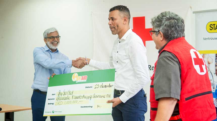 De donatie van SRD 1.000.000 is een bijdrage aan de ‘Gi Wan Anu’-campagne van Stichting Su Aid. Met deze campagne haalt Su Aid geld op voor de Nationale Bloedbank Suriname. De symbolische cheque is op 13 december, door Annand Jagesar, Algemeen Directeur van Staatsolie, overhandigd aan Giwani Zeggen, voorzitter van Su Aid, en Glenn Wijngaarde, directeur van de Bloedbank.