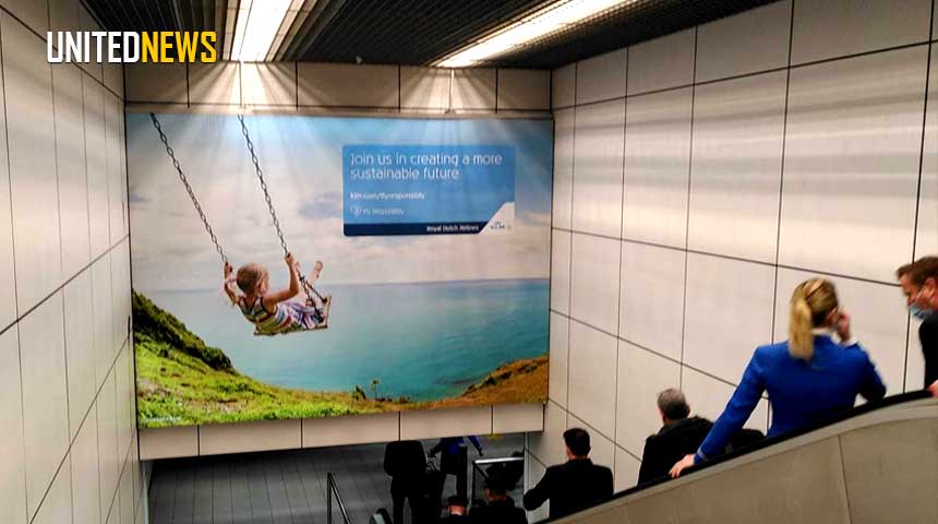 Foto: De reclamecampagne van KLM, die niet in goede aarde viel bij Fossielvrij NL, een Nederlandse milieuorganisatie. | Bron: The Guardian.