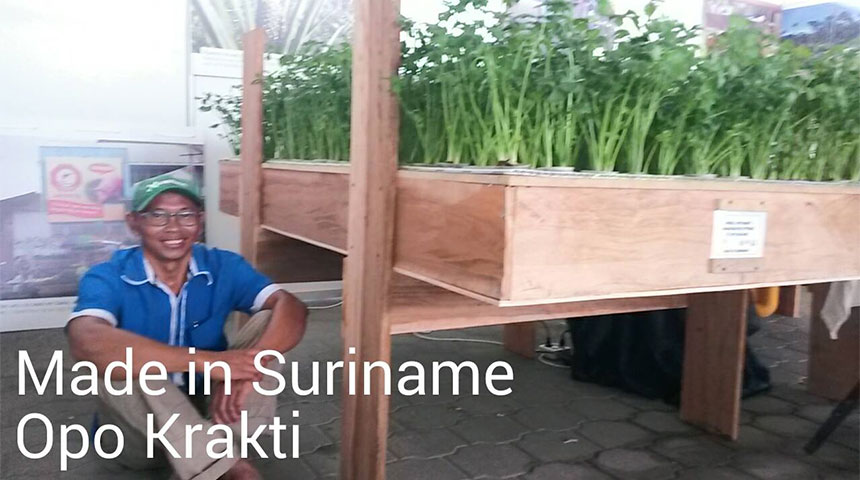 Op the made in Suriname beurs| lokaal telen op water met een globaal concept, gaat voorspoedig in Suriname, Frans-Guyana en met interesse vanuit Guyana en Curacao. Met name de ontwikkeling van ons introductie model van 1 bij 6 meter met overkapping waarmee u in 1 keer 600 plantjes in productie heeft is na 75 gerealiseerde projecten, 300 getrainde telers en meer dan 60.000 geleverde plantjes een succes te noemen
