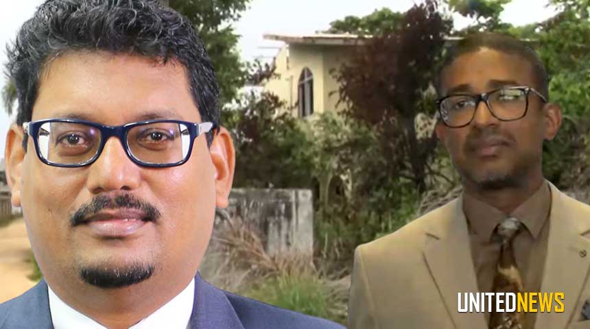 Fotocompilatie: fractieleider van de VHP Asiskumar Gajadien, minister van Binnenlandse Zaken (BiZa) Delano Landvreugd, en op de achtergrond een pand in verval op het toegewezen stuk grond.