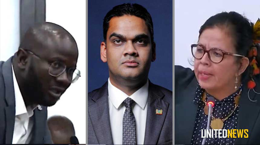 Fotocompilatie: Ebu Jones en Jennifer Vreedzaam van de NDP-fractie en minister Amar Ramadhin van Volksgezondheid.