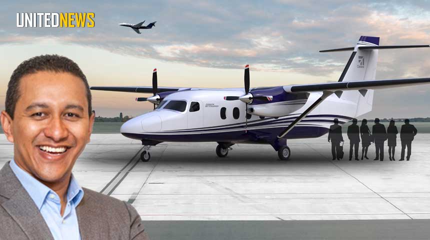 Foto: Links Timothy Mendonça, directeur van EAG Airport Management, rechts de splinternieuwe 19-seater Cessna SkyCourier