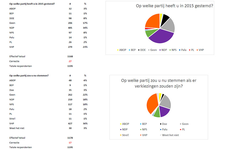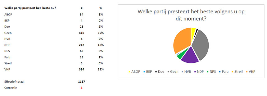 Wat ook opvallend is, is de enorme groei van de zwevende kiezer want maar liefst 35% van de respondenten geeft aan GEEN enkel partij het beste te vinden. En op de vraag op wie men nu zou stemmen mits er verkiezingen zouden zijn staat de VHP op nummer 1 met 36% gevolgd door GEEN op 22% en de NDP op derde plek  18%.