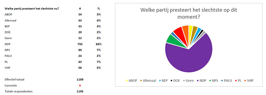 Dus ook hier neemt de zwevende kiezer een sterke positie in.  Wat ook kans zou moeten creëren voor mogelijke nieuwe op te richten partijen. Desalniettemin ondanks de neerwaardse trend van de NDP blijft deze toch behoren tot één van de  grootste partijen van Suriname met een loyale achterban.  Op de vraag welke partij men op dit moment het slechtste vindt presteren, heeft maar liefst 66 procent NDP ingevuld, gevolgd door de NPS en PL. Die laatste twee staan op dezelfde hoogte met elk 7%.   De NPS heeft een negatieve performance ratio omdat meer mensen de NPS slecht vinden functioneren dan goed. De NPS groeit dan ook met amper 2 procent. Eigenlijk ongekend omdat de NPS altijd goed heeft gescoord tijdens een crisis periode en dat effect lijkt zich niet te herhalen.