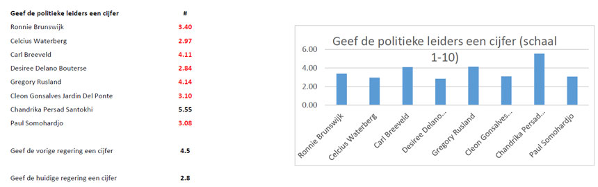 De respondenten konden de leiders ook een cijfer geven van 1 tot 10.   President Bouterse kreeg het laagste gemiddelde met een 2.8 gevolgd door de geplaagde Celcius Waterberg 3 en als derde Paul Somohardjo en Cleon Gonsalves del Ponte beiden 3.1,  Ronny Brunswijk 3.4,  Carl Breeveld en Gregory Rusland beiden 4.1.  De enige met een nipte voldoende is Chandrikapersad Santokhi met een 5.6.   Verder is  uit het onderzoek ook duidelijk geworden dat de respondenten de regering Bouterse-Ameerali  beter vonden presteren dan de regering Bouterse-Adhin.  Want de regering Bouterse 1 kreeg een 4.5 en Bouterse 2 een 2.8.  Het onderzoek bevat voornamelijk significante data voor Paramaribo, Wanica, Nickerie en Commewijne. Het onderzoek is in alle districten ingevuld. Met de meeste respondenten uit voorgenoemde.