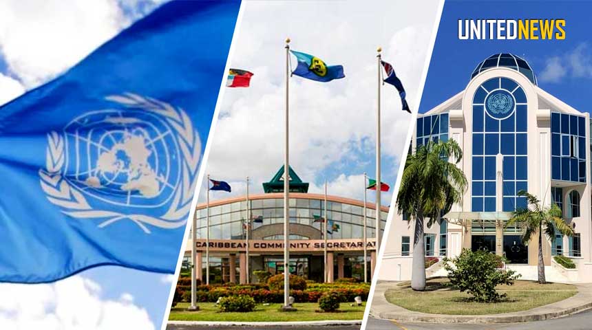Foto compilatie: De vlag van de Verenigde Naties, het hoofdkwartier van de Caricom in Georgetown,Guyana en het VN-huis op Barbados.