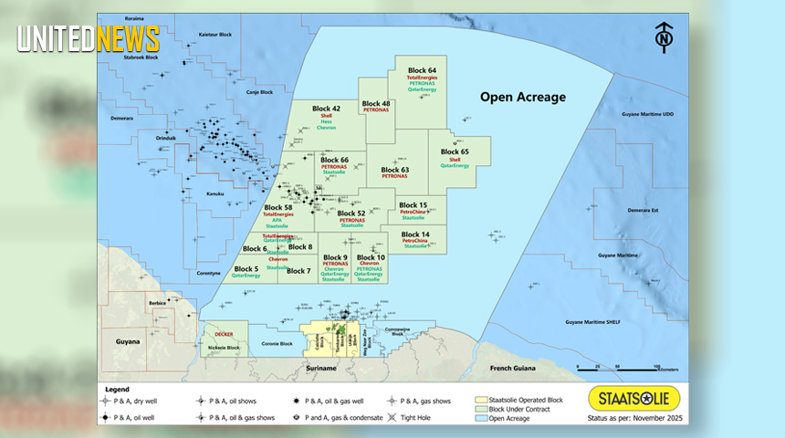 Staatsolie Maatschappij Suriname N.V. heeft op woensdag 5 november 2025 productiedelings-contracten (Production Sharing Contracts) ondertekend voor de offshore blokken 9 en 10. Deze contracten zijn getekend met de operators PETRONAS Suriname E&P B.V. (Blok 9), en Chevron Suriname Exploration Limited (Blok 10).