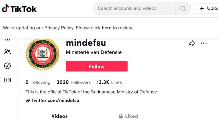 Foto: Het Tiktok profiel van het Ministerie van Defensie Suriname