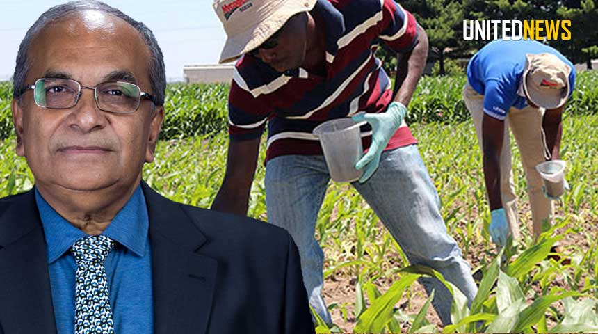 Fotocompilatie: Minister Parmanand Sewdien van Landbouw, Veeteelt en Visserij (LVV) met op de achtergrond landbouwers bezig met hun aanplant.
