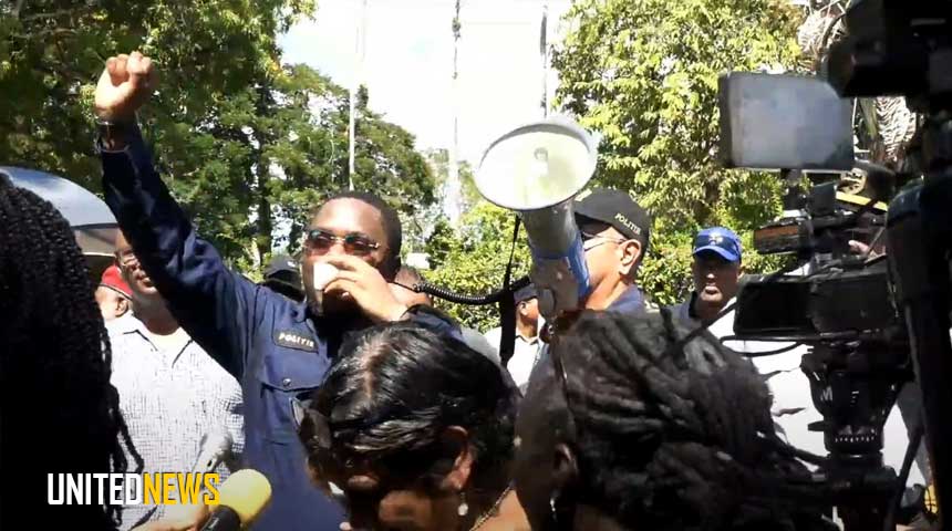 Foto: Mielando Atompai Voorzitter van de Surinaamse Politie Bond aan het woord tijdens de acties van de gezamenlijke vakbonden.