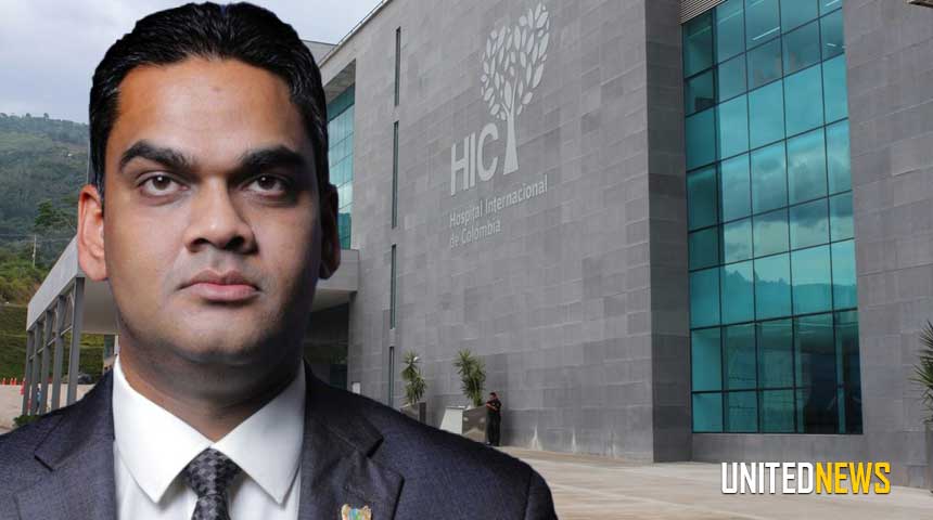 Foto: Minister Amar Ramadhin van Volksgezondheid, en op de achtergrond het ziekenhuis “Hospital Internacional de Colombia” in Bucaramanga, Colombia.