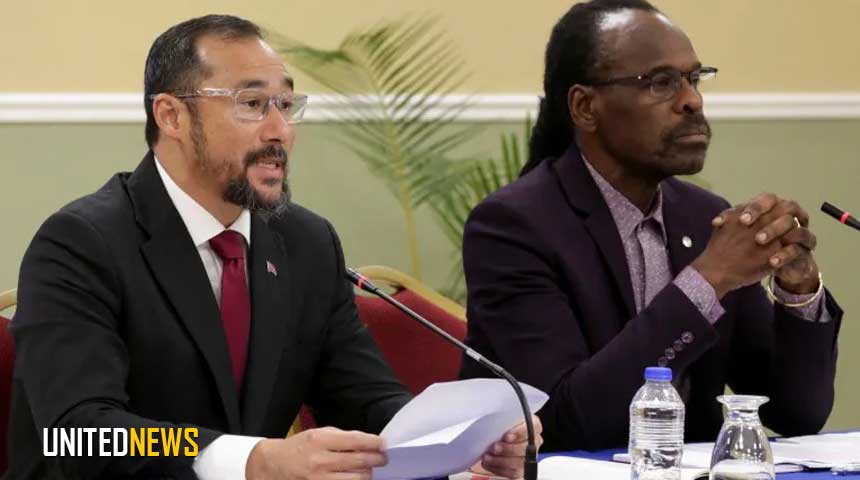 Foto: Waarnemend procureur-generaal Stuart Young (links) en minister van Nationale Veiligheid Fitzgerald Hinds geven een persconferentie om de noodtoestand toe te lichten op 30 december. | Bron: Al Jazeera.