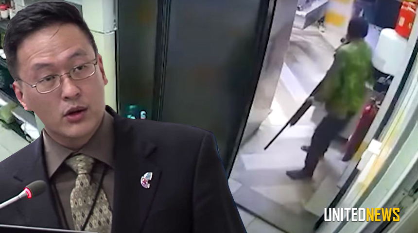 Fotocompilatie: Parlementslid Stephen Tsang van de Nationale Democratische Partij (NDP) en op de achtergrond een momentopname van de gewapende beroving bij Murphy’s in de IMS Mall.
